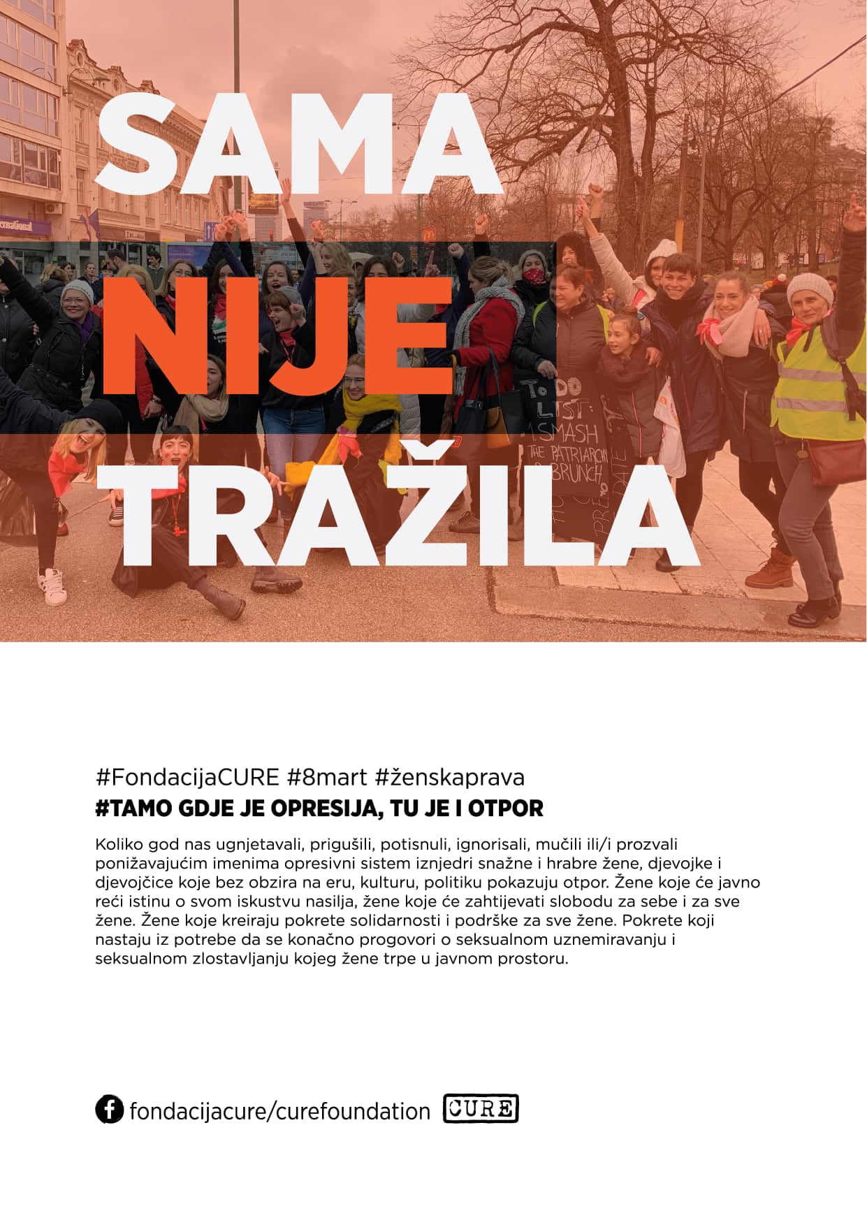 Svi zajedno, uličnom akcijom i mirnim okupljanjem, ukazali smo na to da ne možemo nastaviti odgajati generacije koje ne znaju da žene nisu krive što su preživjele nasilje i pokušali pokazati da je važno imati Nultu toleranciju prema nasilju nad ženama, djecom i muškarcima. Seksualnom uznemiravanju, zlostavljanju, diskriminaciji, netoleranciji i politici ignoriranja žena mora doći kraj bila je poruka je koju su udruženi uputili: Zaboravljena djeca rata, Fondacija CURE, Fondacije Krila nade, Schuler Helfen Leben BiH, TRIAL International, Udruženje ŽRTVE RATA FOČA, Atlantska Inicijativa / Atlantic Initiative, CAT Bosna i Hercegovina, Humanity in Action Bosnia and Herzegovina i Centar za obrazovne inicijative Step by Step. Akcija je završena pridruživanjem osmomartovskom maršu, a nije propuštena prilika da se istankne važnost obrazovanog sistema, odnosno edukacije trenutnih i budućih generacija.